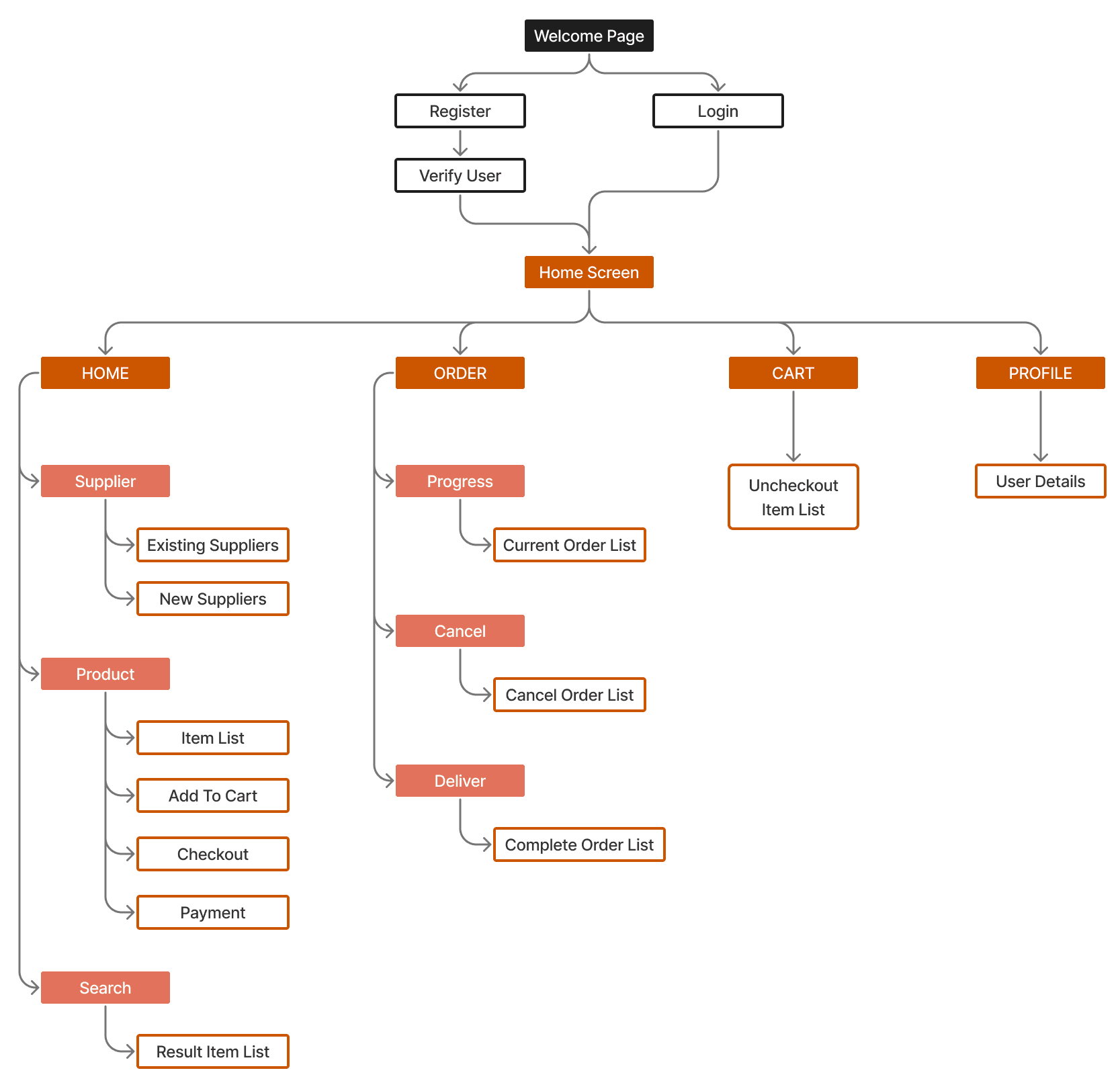 This is the complete user flow from a new user registering their shop, through discovering and connecting with suppliers, placing their first order, and tracking it all the way to delivery. Mapping this in full before building helped identify where drop-offs could happen and where the flow needed to be tightened.
