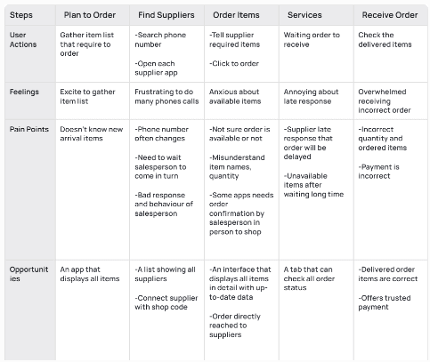 As the sole designer, I conducted field research with both shop owners and suppliers, mapped pain points into user journeys and personas, running competitor analysis, sketching and wireframing flows, designing high-fidelity screens, and running usability testing with eight participants.
