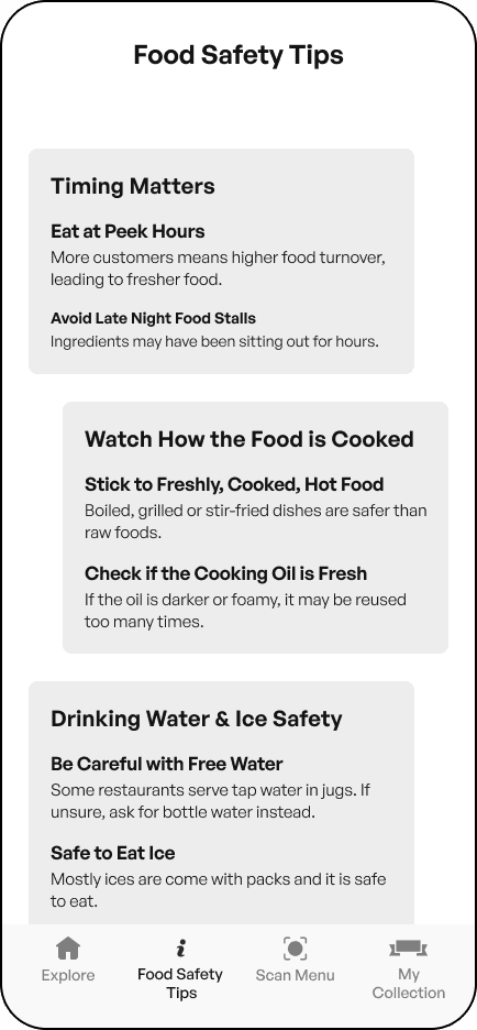 Street food safety isn't about avoiding stalls, it's about knowing the signs of a good one. Simple, practical tips built into the app give travelers the confidence to make their own judgment calls: fresh food, clean cooking, busy crowds.