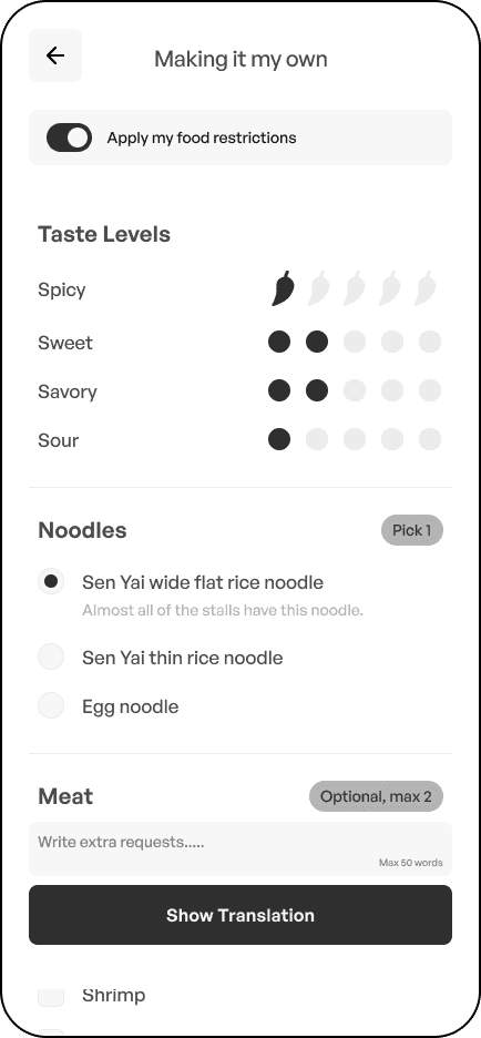 One of the biggest frustrations backpackers described was not knowing they could customize their order and not being able to communicate it, even when they tried. This feature lets travelers set their spice level, ingredient preferences, and flavor profile in the app, reducing the communication gap to almost nothing.