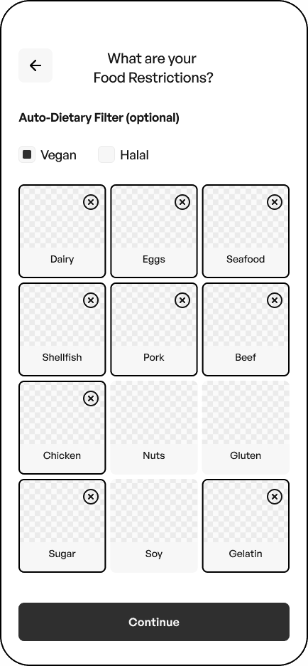 The allergy filter was the most critical feature to get right. Travelers with dietary restrictions especially vegetarians, navigating hidden meat ingredients are needed a way to set their boundaries once during onboarding and have the app filter accordingly from that point forward. No second-guessing, no re-explaining to every vendor.